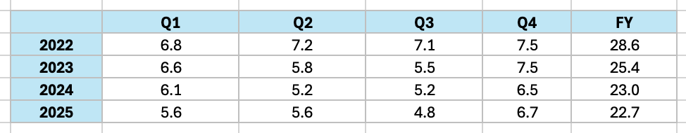 A quick check of the quarterly Devices Serviced metric, to determine if there was some additional lag as devices passed along the chain, revealed an increasing concentration around the iPhone launch cycle. In FY2022, devices serviced ranged from 6.8m to 7.5m across quarters. By FY2025 the range had widened to 4.8m to 6.7m, with Q3 2025 the lowest single quarter on record. As total volumes shrink, the business is becoming more dependent on a single annual event to drive throughput. Unsurprising given Apple’s market dominance perhaps, but notable.