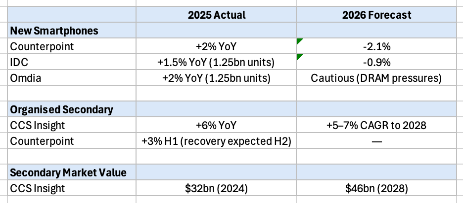 Far more credibly, Counterpoint’s final view of 20254 sell-in clearly showed Apple as the winner in the growth stakes putting on 10% to take a 20% market share overall. Samsung also appeared to benefit from the flight to premium devices putting on 5% over the year to end up with a 19% market share. Xiaomi, Vivo and Oppo remained flat in the top five, outside of which Nothing and Google performed well with 31% and 25% YoY growth respectively. However the general view is that primary market growth continues to decelerate. Counterpoint, IDC and Omdia all forecast flat-to-negative new shipments in 2026, with memory-cost pressures (CCS Insight’s Ben Wood’s “Ramageddon” sums it up nicely) weighing on ASPs and consumer demand. By contrast, the organised secondary market is emerging as the growth engine, with CCS Insight forecasting +6% growth in 2025 rebounding to sustained 5–7% expansion through 2028. Counterpoint's H1 data showed refurbished units at only +3% YoY, but expects recovery as trade-in programs scale. The secondary market is now estimated at $32B (2024) growing to $46B (2028), representing roughly 25% of new device sales in 2025 and growing market share. Here’s a summary:
