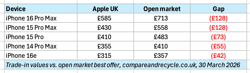 Regardless of what the consumer thinks their device is worth, market values are probably the more reliable indicator. As first reported by MacRumors, in the US, Apple has decided that your iPhone 16 ProMax is worth up to $15 more than it was last month5. Looking at the UK, Apple came to a different conclusion and decided the same phone was now worth up to £65 less at £585, down from at least £650 in December, and at the time of writing a significant £128 below the open market. Across the complete iPhone range there are ups and down with the iPhone 15 Pro Max falling the most in percentage terms down 17.3% to £430 from £520, again £128 below the open market. Whether that’s coincidence or reflective of Apple’s internal pricing logic can’t be determined from this data set alone.