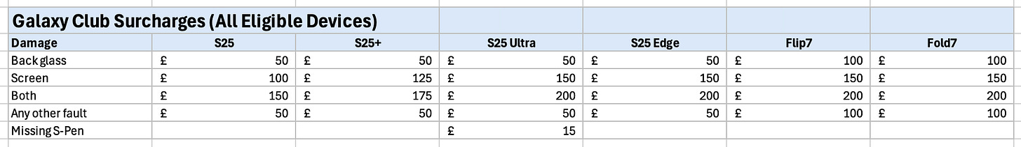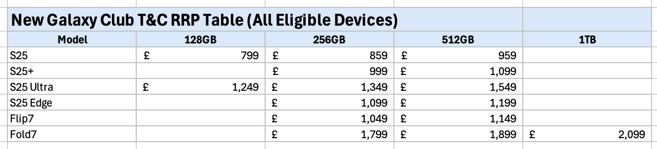 The guarantee offered the consumer 50% of the device RRP if upgrading between months 12-15 addressing Samsung’s market disadvantage of lower residual values. Eagle-eyed readers may note that the RRP price schedule as defined in the New Galaxy Club Terms and Conditions listed the Z-Fold7 1TB at £2,099 versus the retail launch RRP at £2,149. A genuine mistake, or did someone decide to bake a bit of arbitrary risk management into the small print with a residual value guarantee at 48.8% on Samsung’s most expensive device. The other difference may have been unintended, but the S25 Ultra storage labels are incorrect. Sloppy.