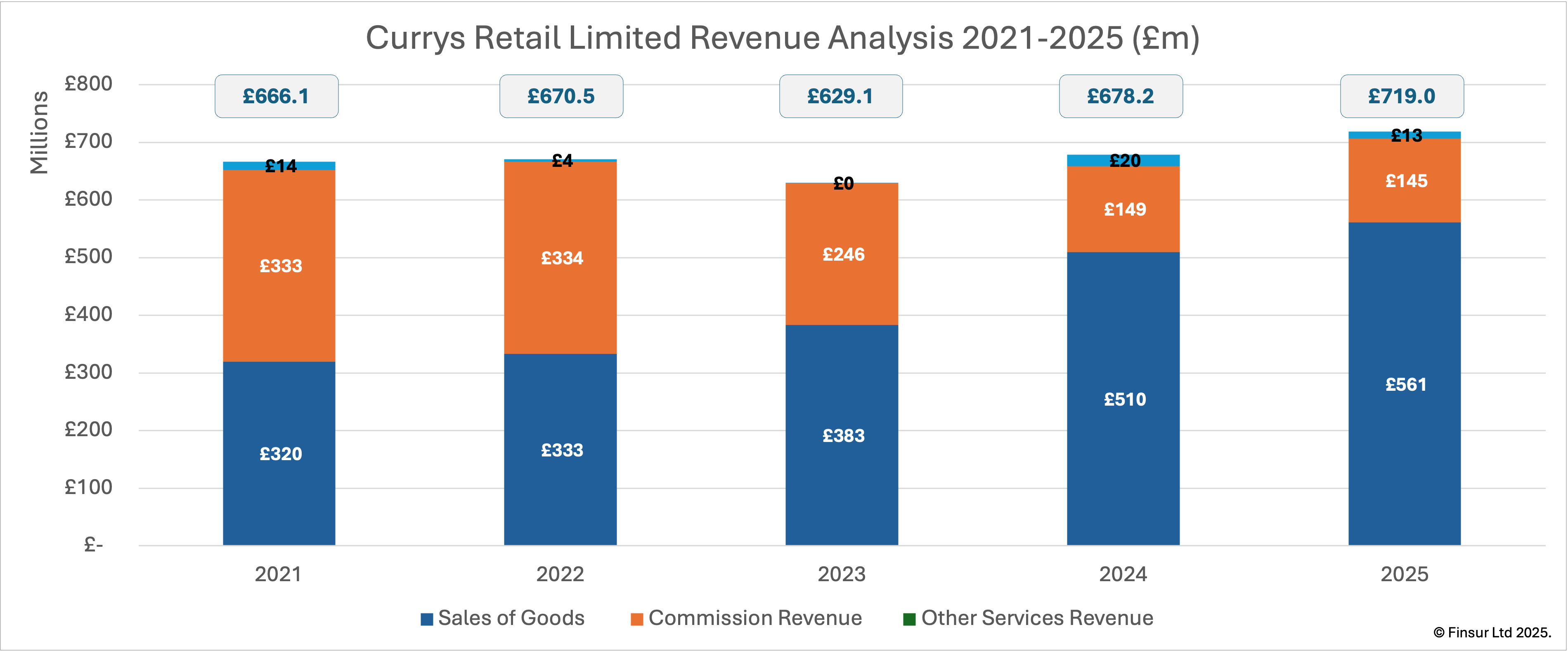 Total FY2025 revenue increased 6.0% or £40.8m to £719.0m, from £678.2m in FY2024. Over the five-year analysis period that’s an 1.9% compound annual growth rate from a £666.1m baseline in FY2021. This year subsidiary’s growth featured in the PLC report, with management highlighting handset-only sales and iD Mobile as the strongest performing categories. Behind the headline growth, however, the revenue mix has been shifting significantly, driven in part by the long-term decline of network commission revenue following the termination of EE and O2 contracts.