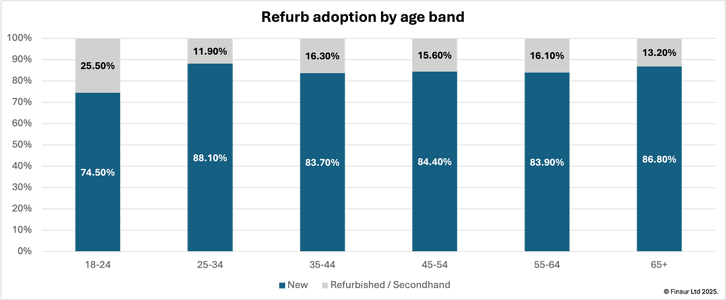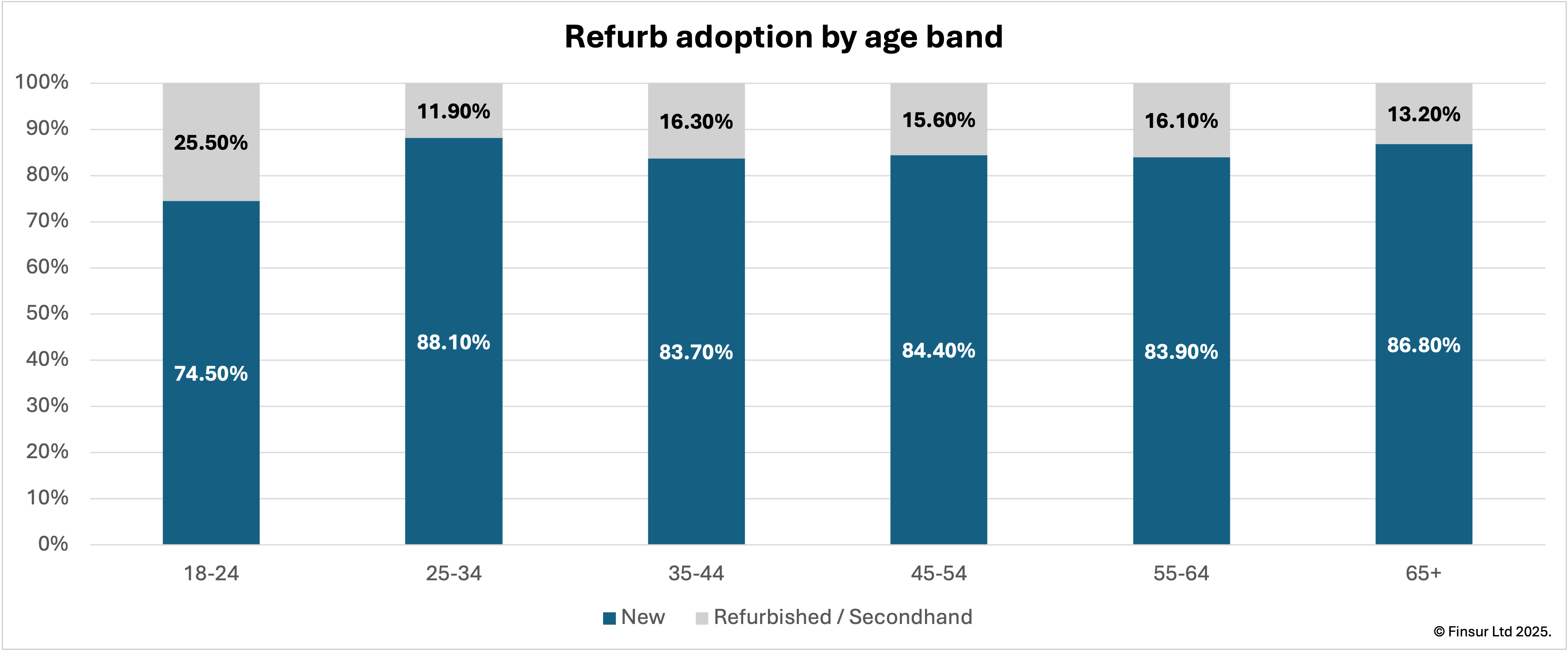 The survey results show that age emerges as the strongest predictor of refurb adoption. The 18-24 cohort shows the highest refurb rate at 25.5%, declining steadily through age bands to 13.2% among those aged 65+. The variation suggests younger buyers either face greater price sensitivity, have more comfort with secondhand technology (which is mostly sold online), or respond more strongly to sustainability messaging around refurbished devices.