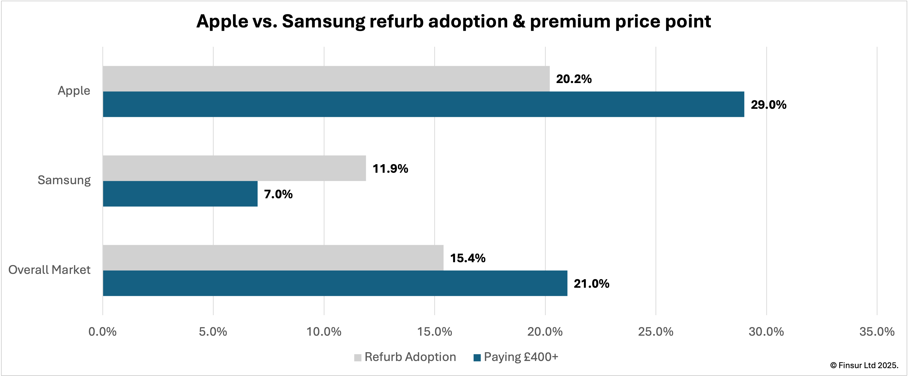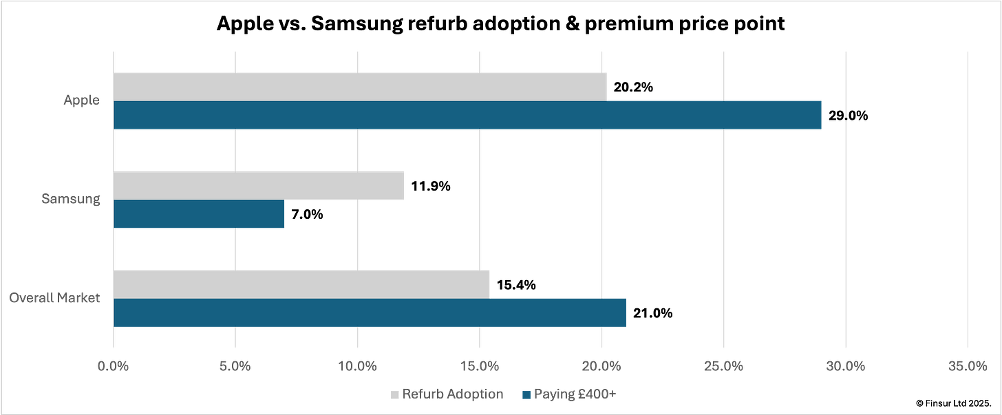 Income patterns show Apple refurb adoption declining from 29% among those earning under £25k to 13% among those earning over £100k. The higher rate among lower earners may include switching from other brands, though it equally likely represents existing Apple users trading down from new to refurb. The presence of refurb adoption among high earners (13%) suggests the technology ceiling plays a part with previous-generation devices meeting utility needs without paying the new premium.